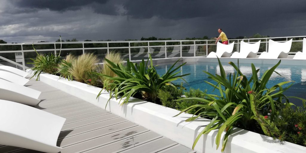 L'objectif de notre client était d'apporter une ambiance conviviale et tropicale/végétale autour des bassins.